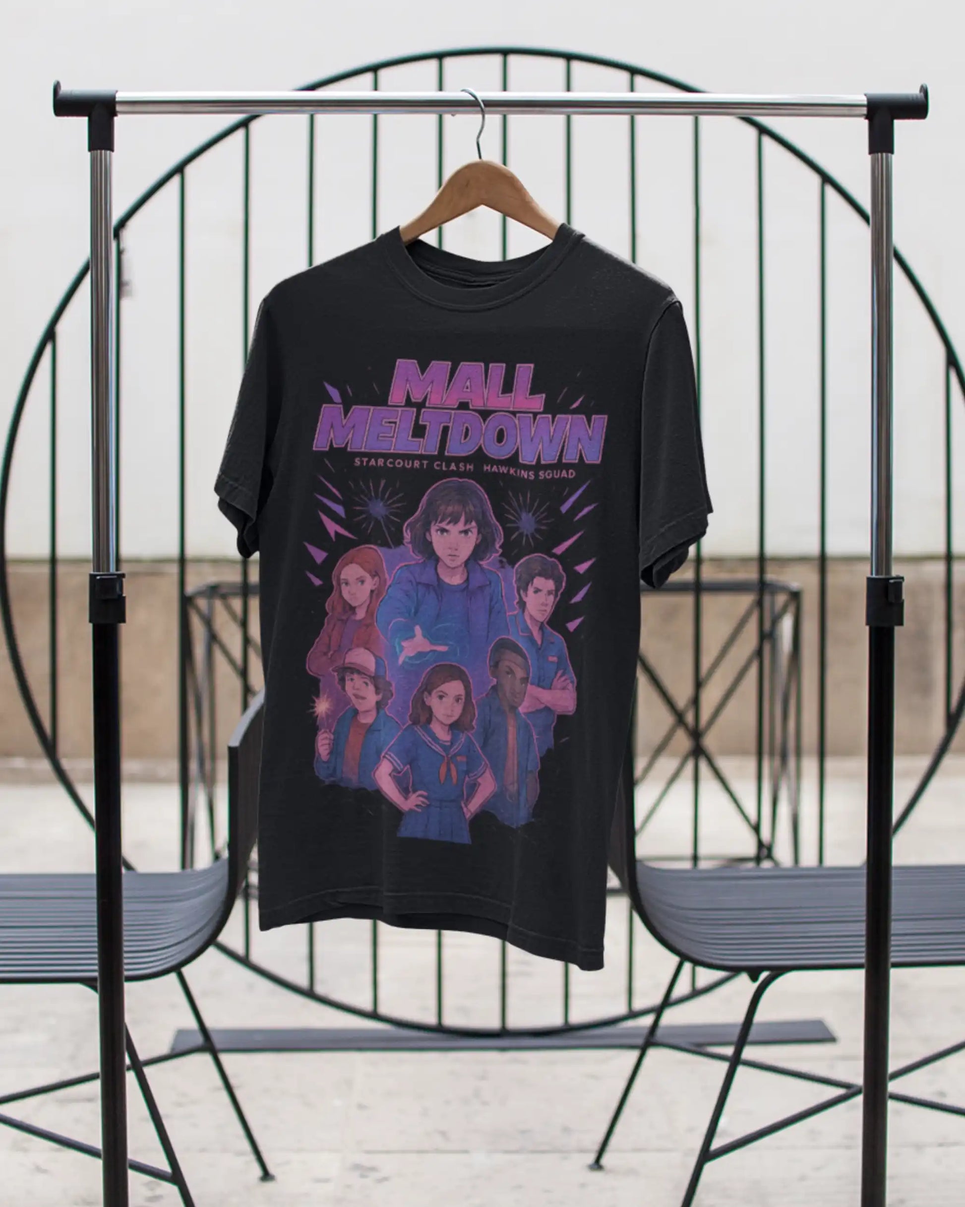 Step into the heart of Hawkins, Indiana, with our exclusive Stranger Things Hawkins Squad T-Shirt – Mall Meltdown Edition!
